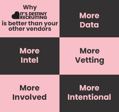 We are not here to replace recruiting efforts, just bring you the best talent as we build relationships with those that exceed quota and are a major culture add. Our job is to make the process inclusive, productive, and transparent for everyone involved so you can focus on making money.