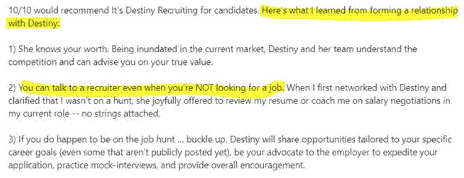 We build relationships with top performers, so when they are ready to make a move, we are their first call *and we can make an intro*